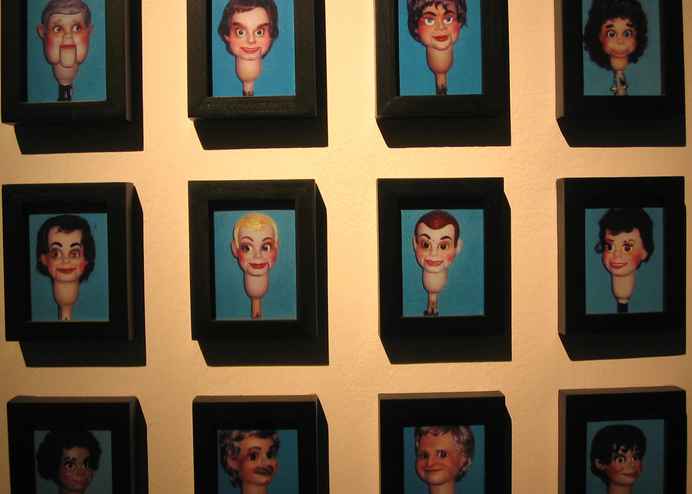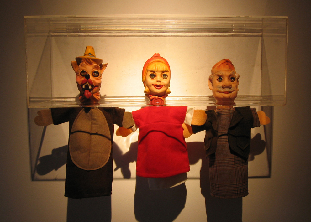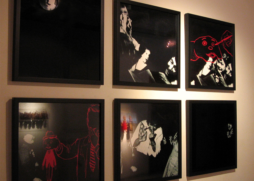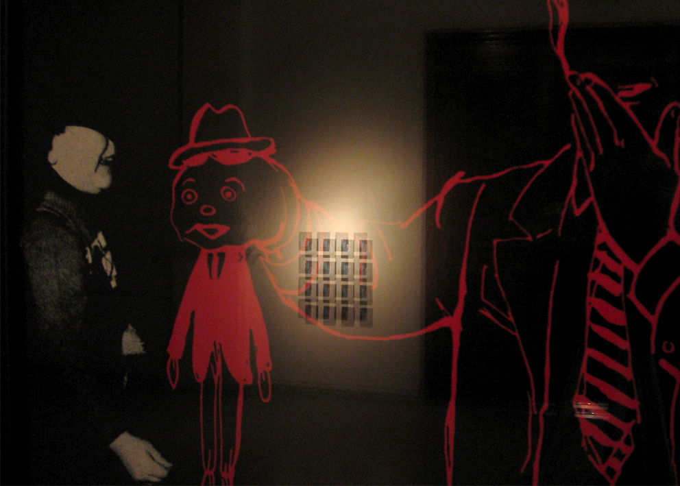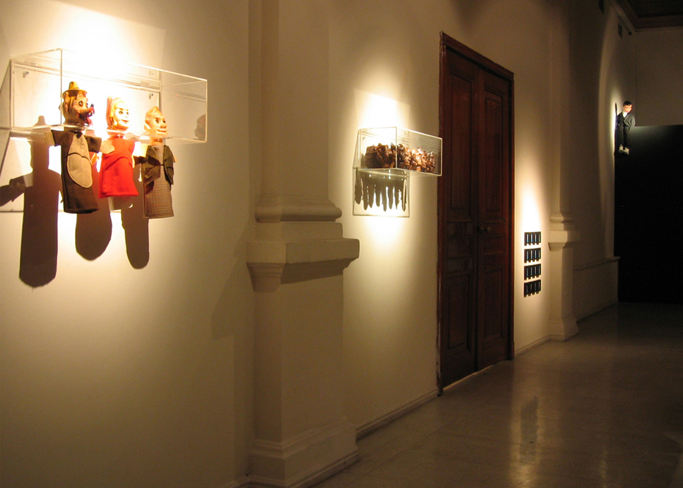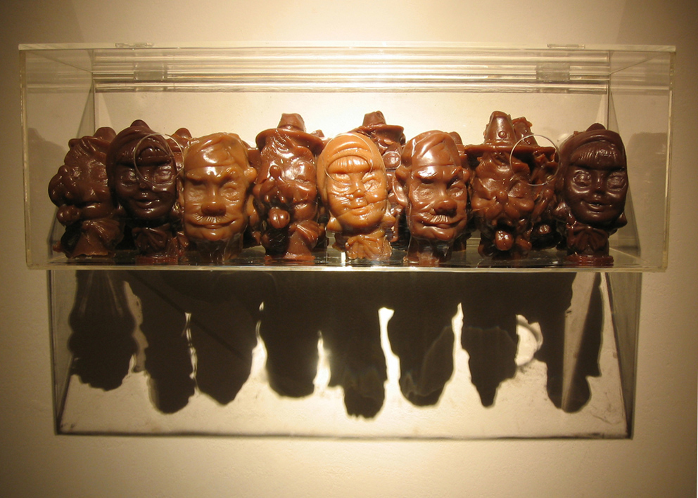 Digital print under cut acrylic, acrylic boxes, puppets, puppet heads molded in wax and chocolate, photographies, self-adhesive vinyl on wall