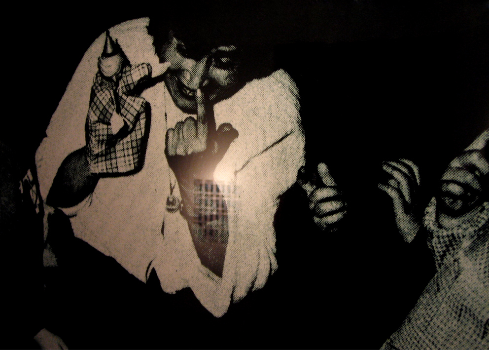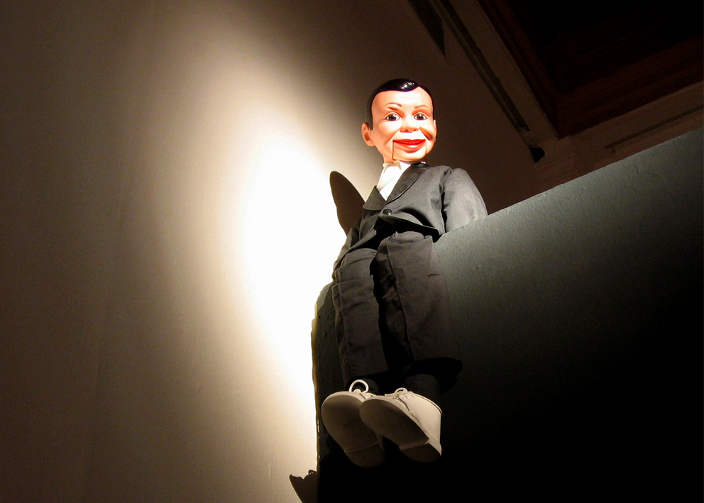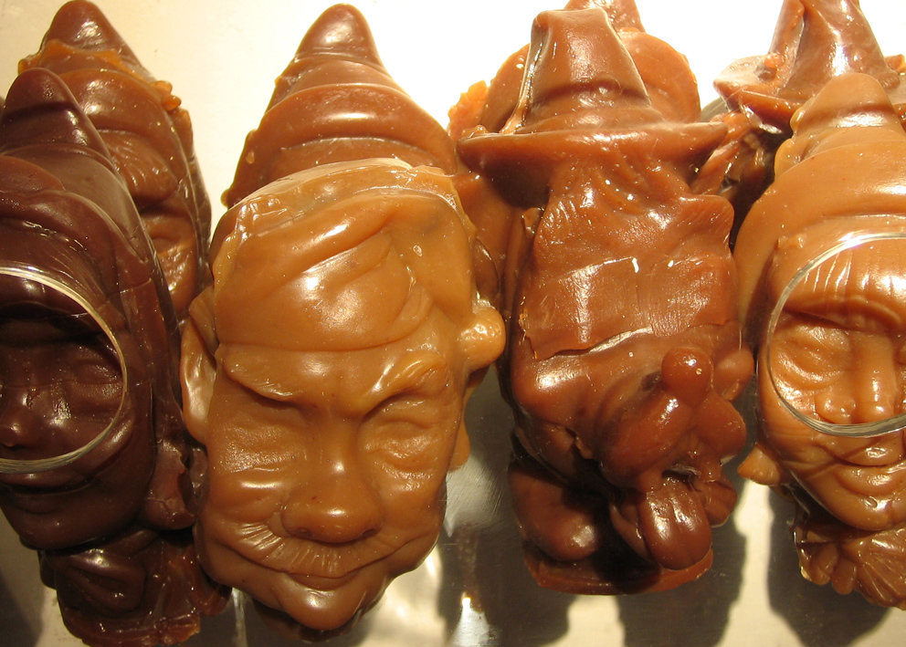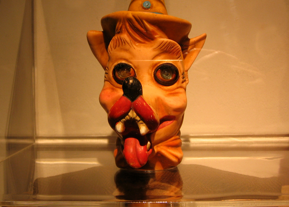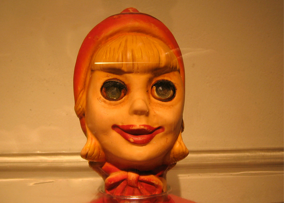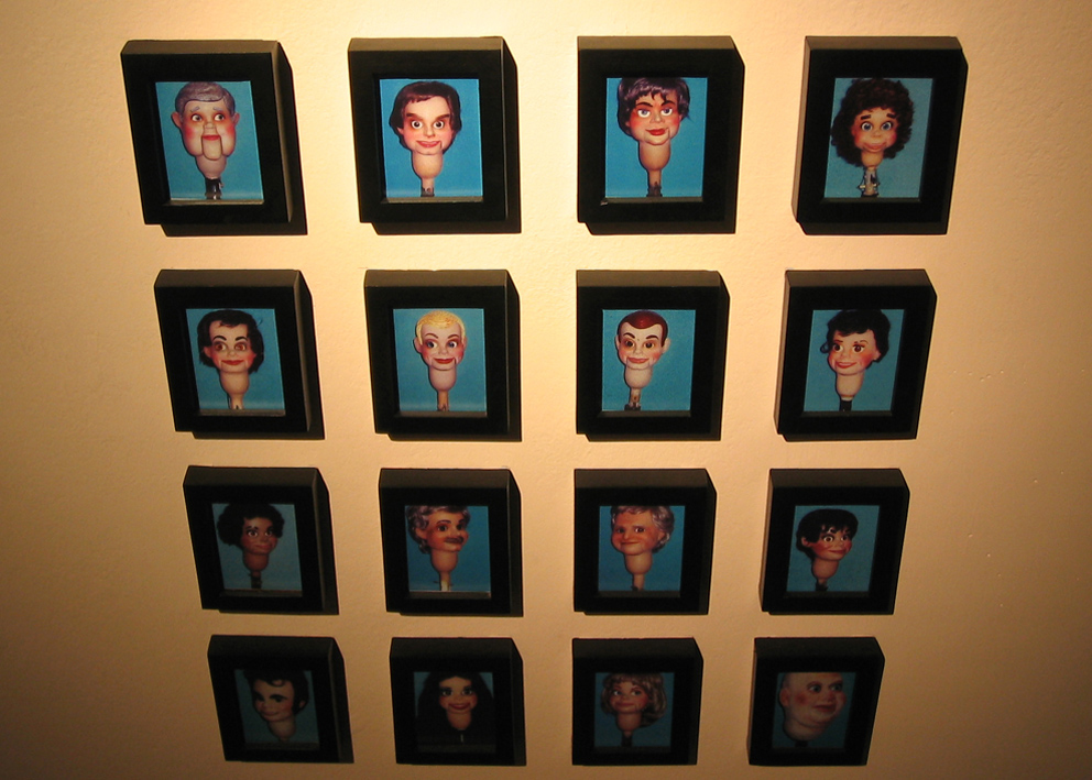 Digital print under cut acrylic, acrylic boxes, puppets, puppet heads molded in wax and chocolate, photographies, self-adhesive vinyl on wall