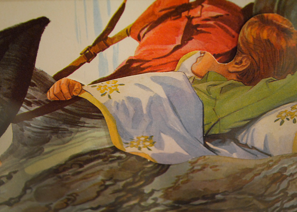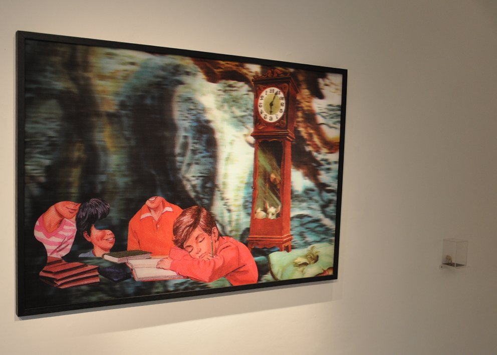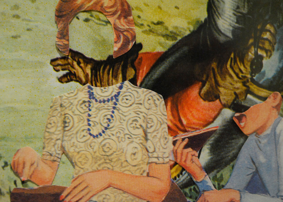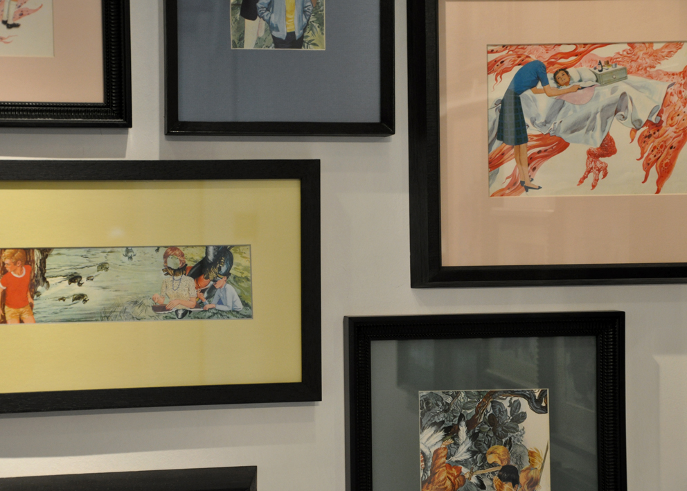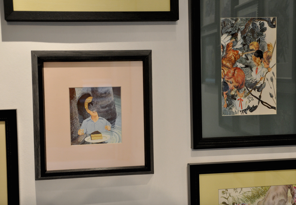Cuentos para la Infancia y el Hogar (Children’s and Household Tales) is a series of collages that take selected elements used in my earlier work Sinfonías Tontas (2009), as well as an earlier series employing imagery from the Disney universe. In this new work, I focus on fairy tales, as well as cultural narratives drawn from folklore such as the Grimm Brothers in Germany. Unlike my earlier works, which focused on specific techniques, this series is predominantly graphic. The basic work material is illustrated children’s books, cut and recombined through the medium of collage.