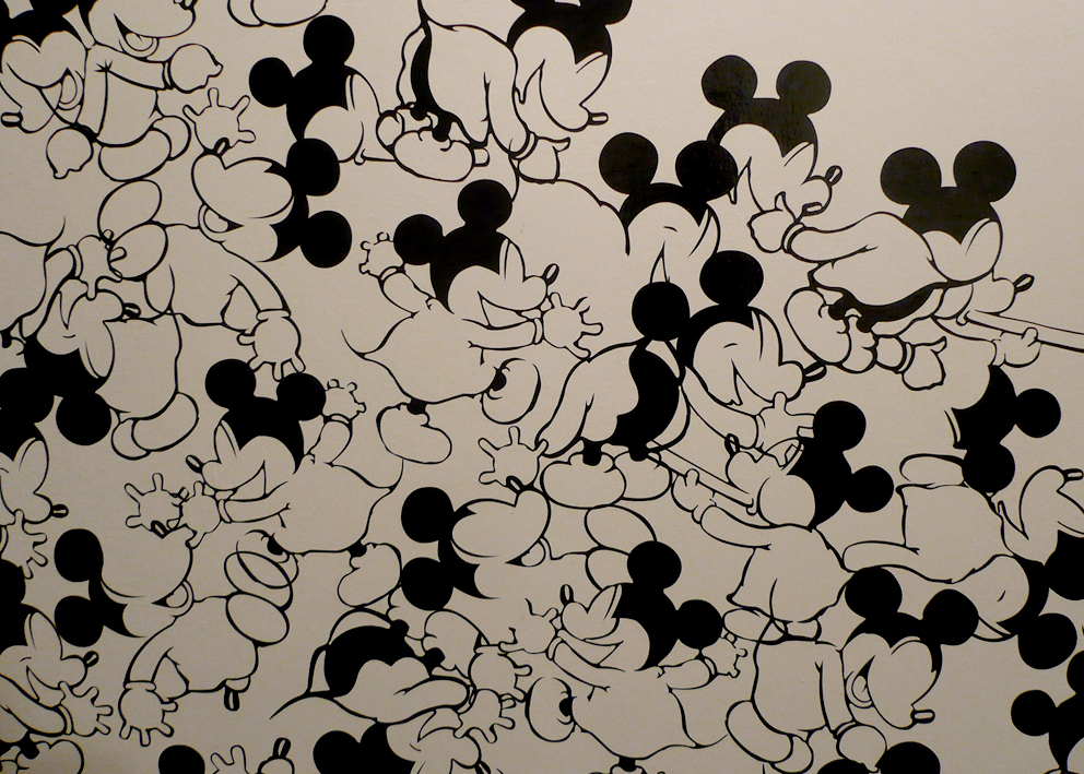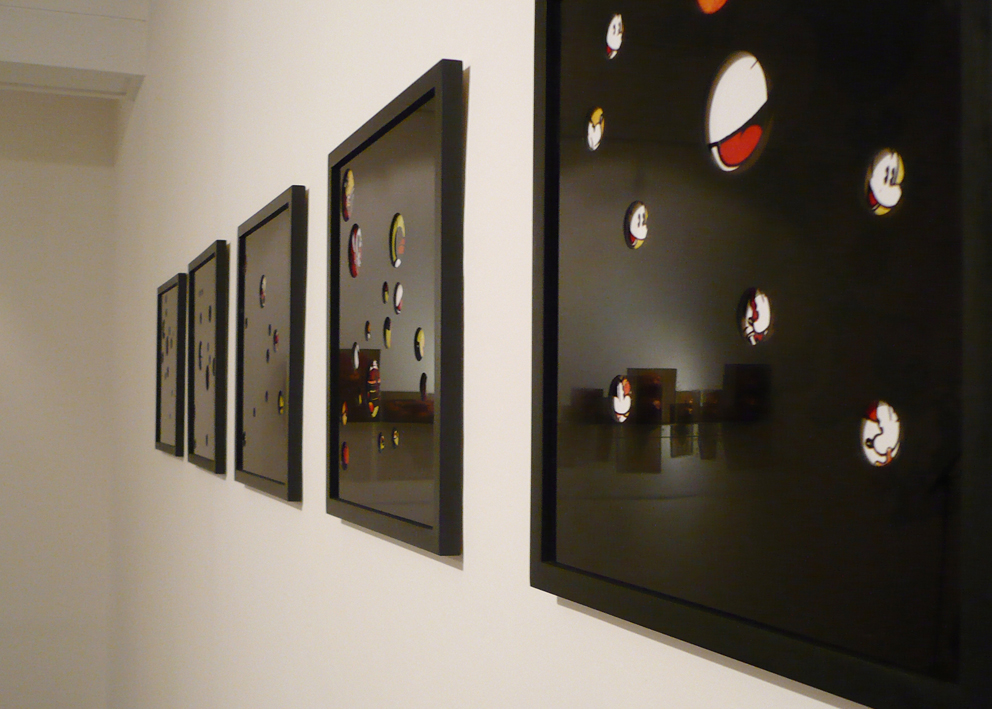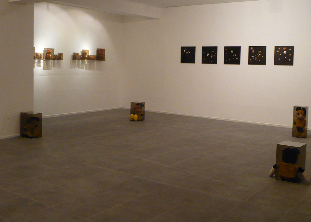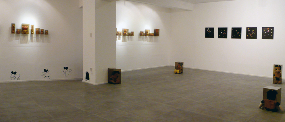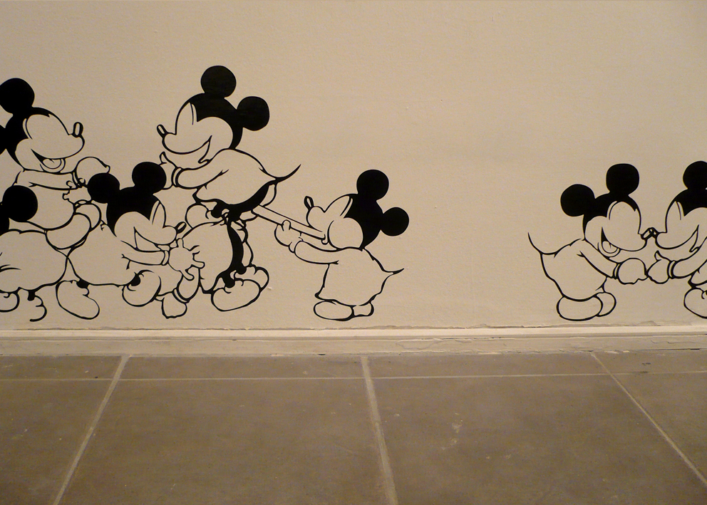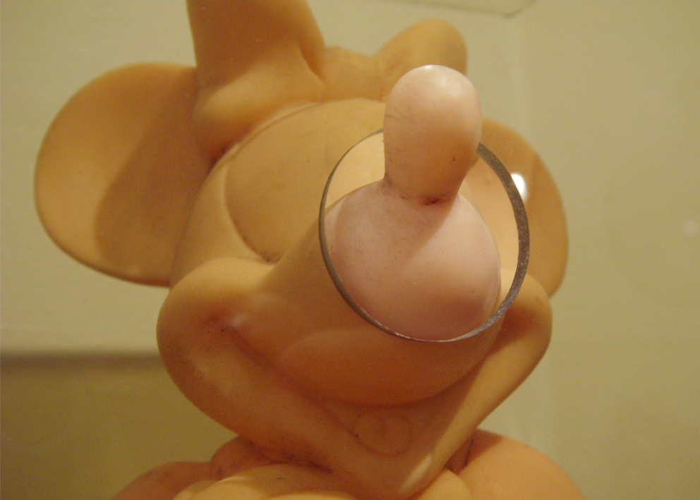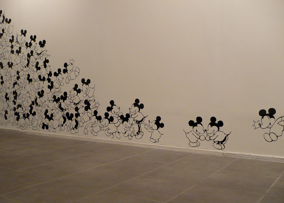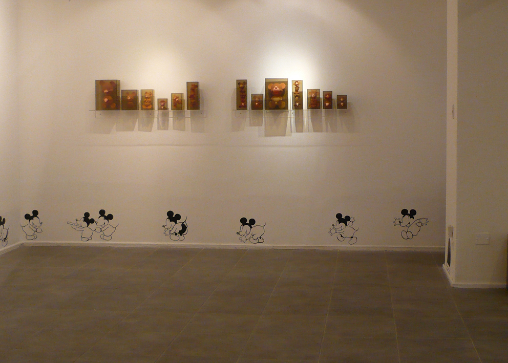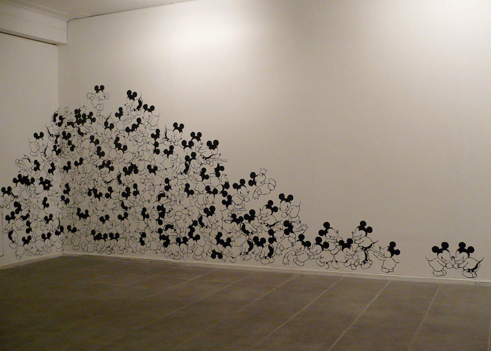 The main goal of the series titled Ratonera (Mousetrap) is to generate a space in which to re-observe certain images and objects that have been set in motion by the multiplicity of modes of communication that surround us. This series focuses on work with the image of one character in particular: Mickey Mouse. This character was selected because of its enormous status as a highly recognizable figure and because of the infinite number of graphic and physical versions present in the culture. My interest in this diversity of representations lies precisely in the repetitive nature of the image, and the way in which its iconic nature can potentially be diluted through repetition.