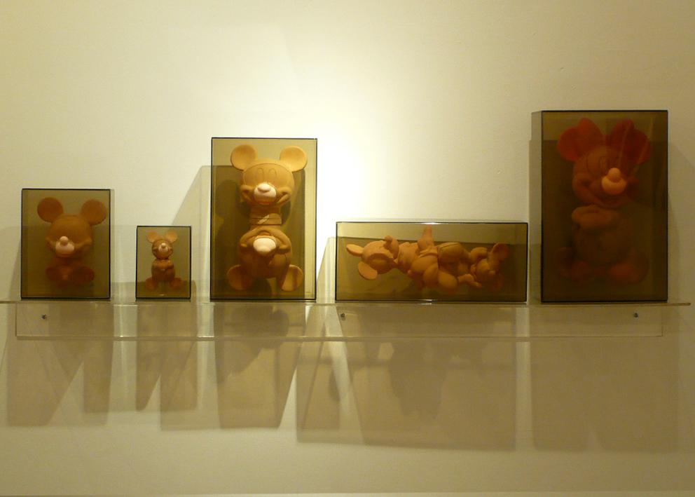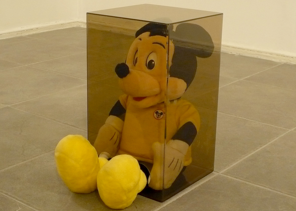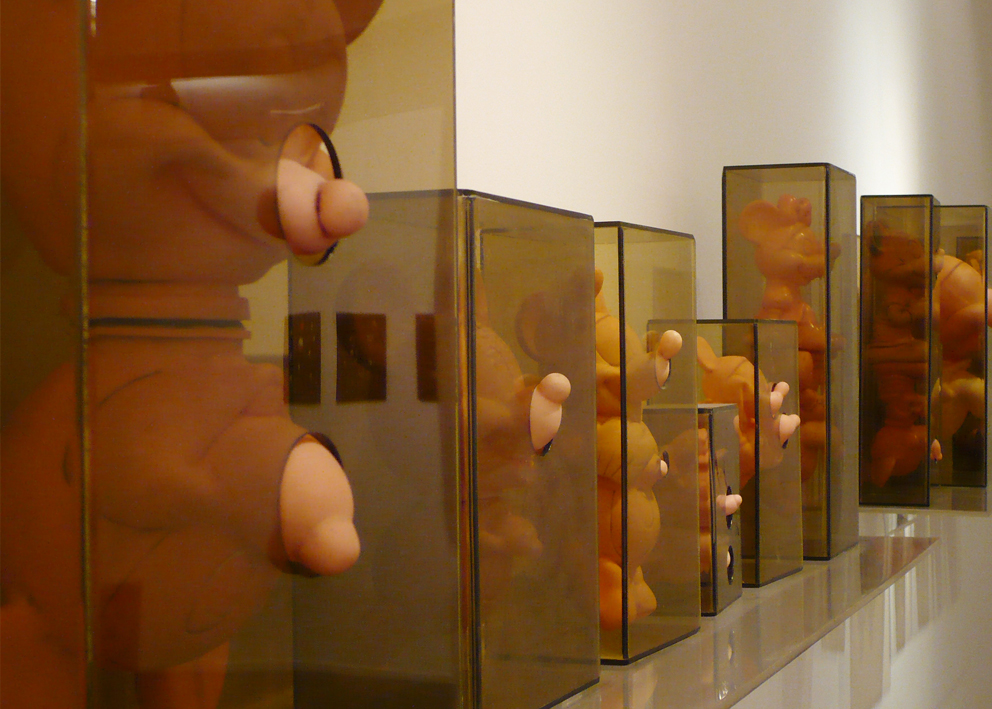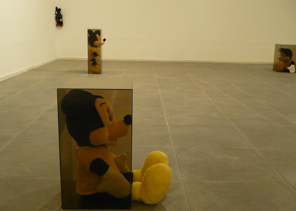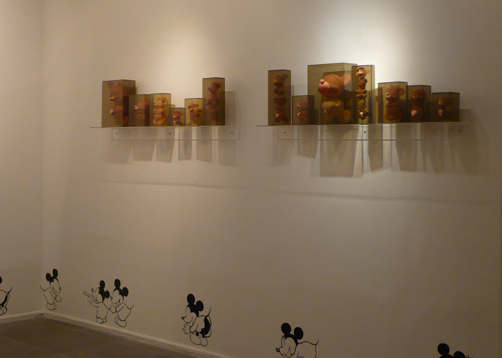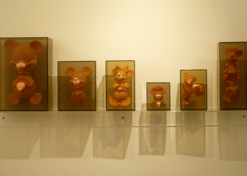 This installation is also related to aspects of collecting since both the graphic images and the objects are the result of a large process of picking and gathering objects in second-hand stores and flea markets throughout the city. Once selected (around 60 Mickey Mouse plastic dolls), I then washed the color off the objects and organized them in pairs so they could later be inserted into acrylic boxes. This procedure situates the objects in a new place of observation and simultaneously parodies the initial state of new toys. Through these operations, I am interested in bringing the Mickey Mouse image into a state of strangeness in order to change the perception of this well-known figure.