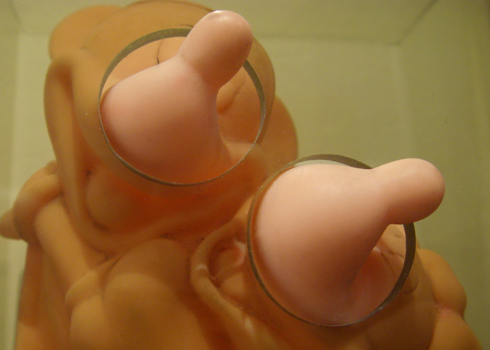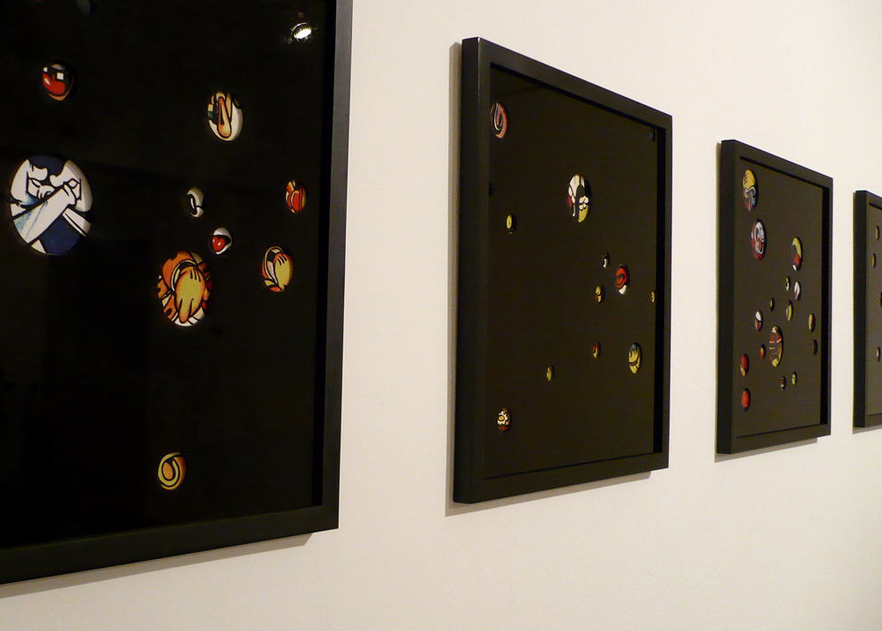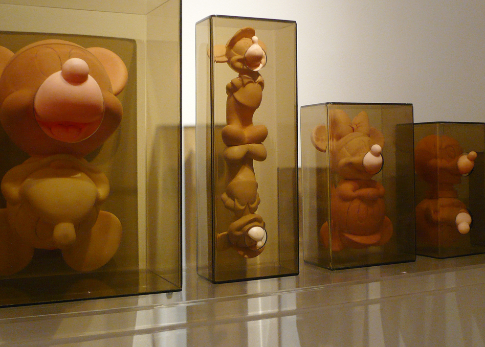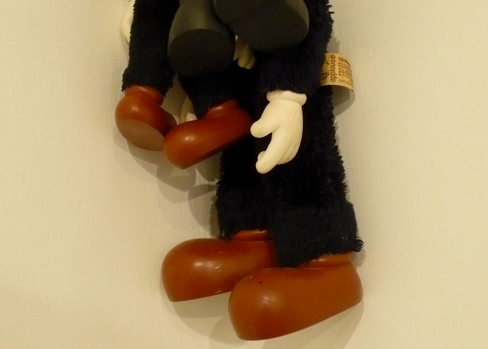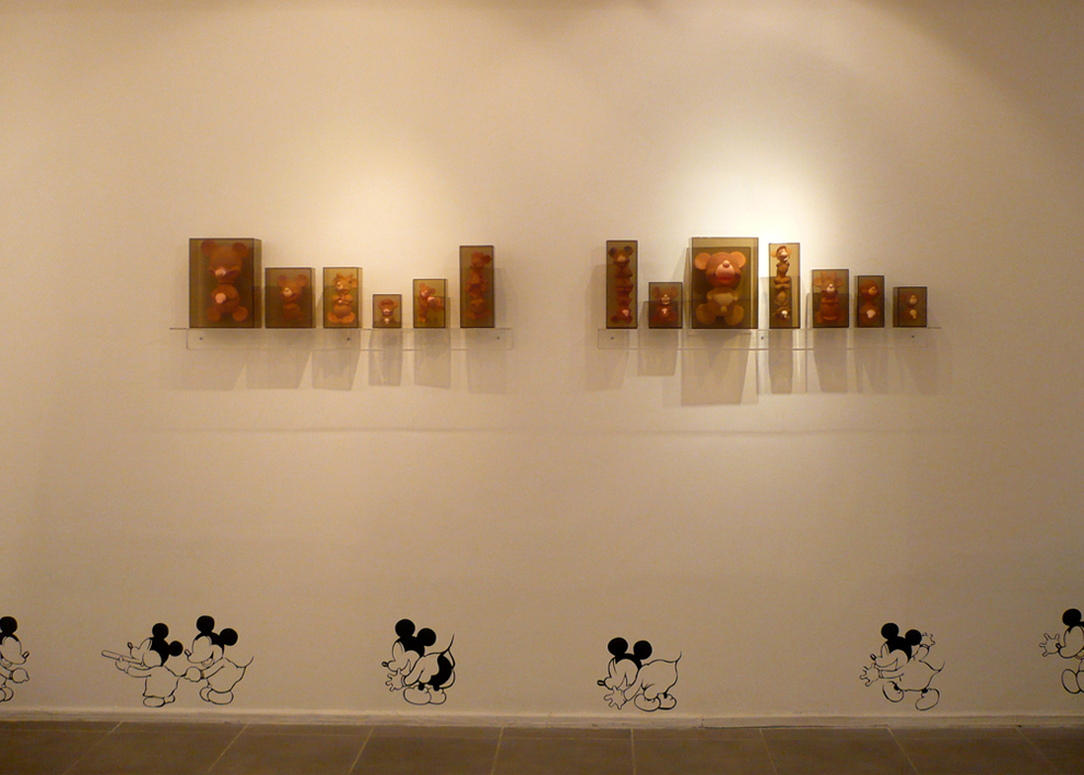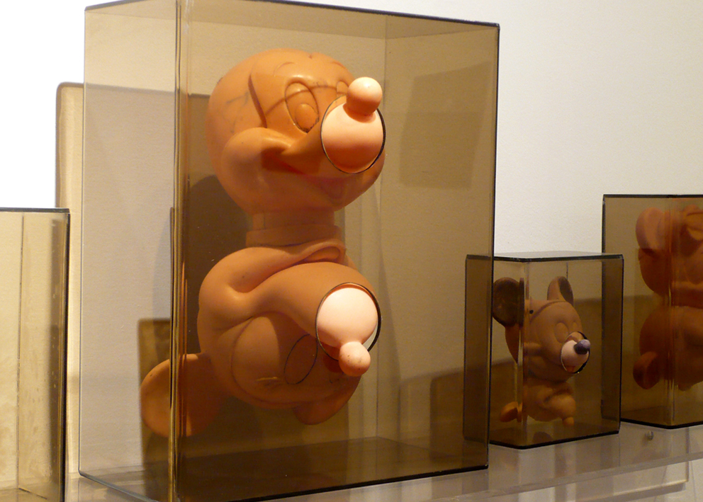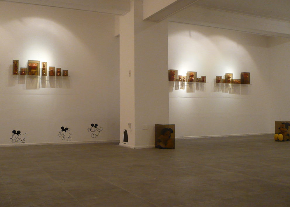 This installation is also related to aspects of collecting since both the graphic images and the objects are the result of a large process of picking and gathering objects in second-hand stores and flea markets throughout the city. Once selected (around 60 Mickey Mouse plastic dolls), I then washed the color off the objects and organized them in pairs so they could later be inserted into acrylic boxes. This procedure situates the objects in a new place of observation and simultaneously parodies the initial state of new toys. Through these operations, I am interested in bringing the Mickey Mouse image into a state of strangeness in order to change the perception of this well-known figure.