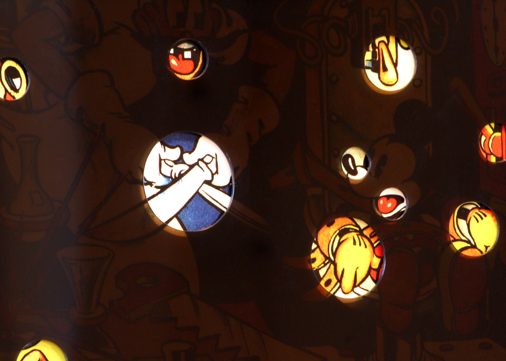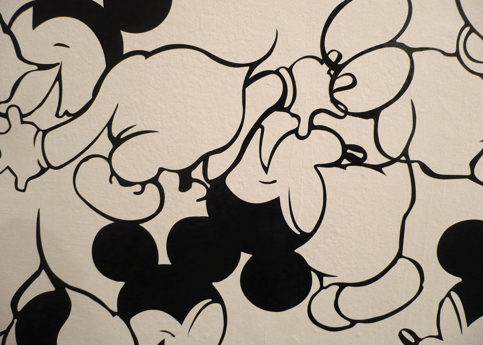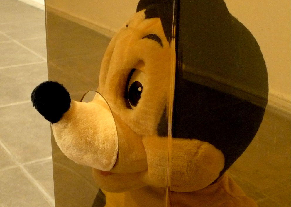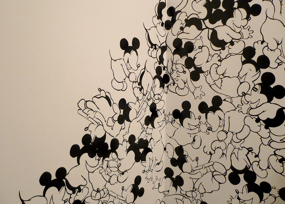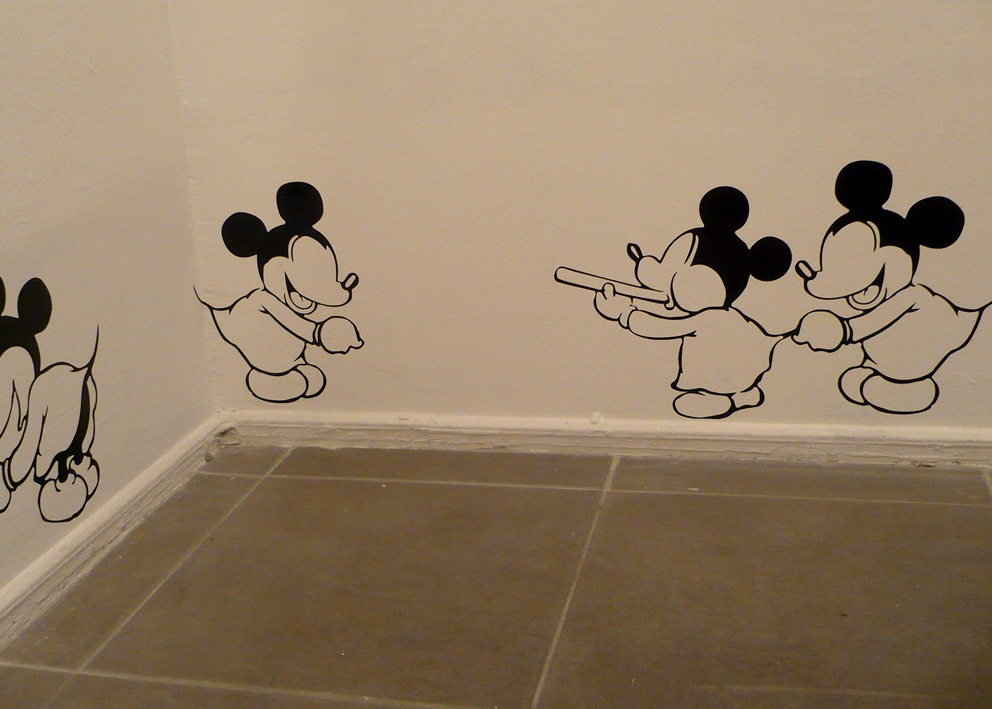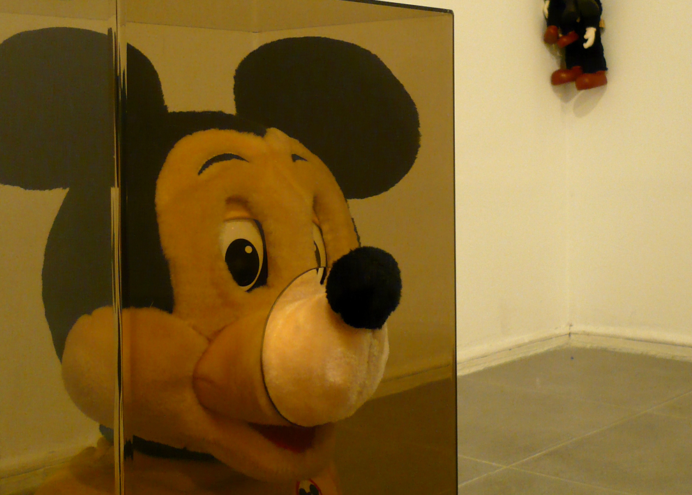 Self-adhesive vinyl on wall, digital print on cut acrylic, bleached plastic heads of different Mickey Mouse dolls, acrylic boxes, acrylic shelves, objects